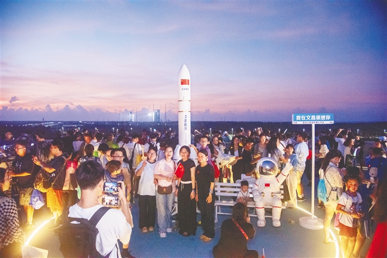 觀看火箭發射的游客拍照留念。本組圖片均由海南日報全媒體記者 袁琛 攝