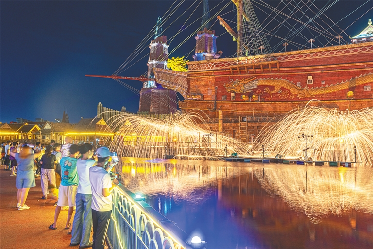 七月十八日,在??陂L影環球100奇幻樂園,游客觀看打鐵花表演。海南日報全媒體記者 袁琛 攝