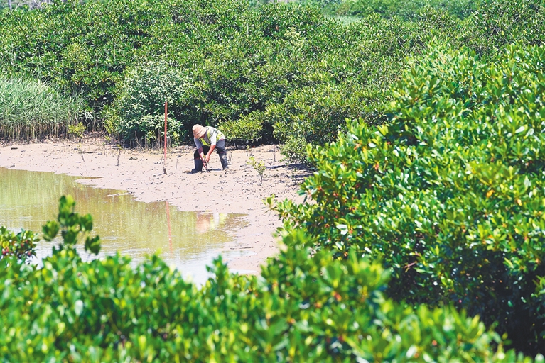 近日,海南東寨港(三江灣)生態修復項目通過了初步驗收。該項目自2023年初啟動,已完成退養還灘2680畝、新植紅樹林1600畝,并對2815畝幼林進行撫育。圖為管護員在補種紅樹苗。