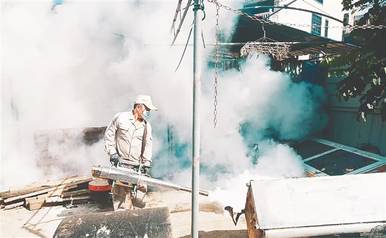 消殺公司人員在??诿捞m區大致坡鎮開展消殺。特約記者 王聘釗 攝