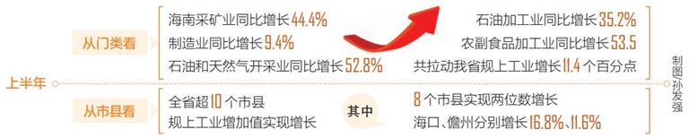 從門類來看,上半年海南采礦業同比增長44.4%,制造業同比增長9.4%;重點行業中,石油和天然氣開采業、石油加工業、農副食品加工業分別同比增長52.8%、35.2%、53.5%,共拉動我省規上工業增長11.4個百分點。