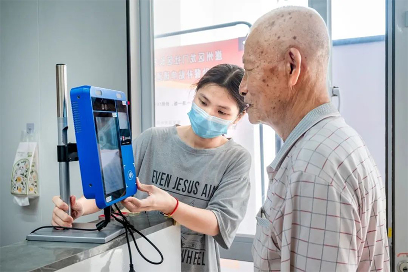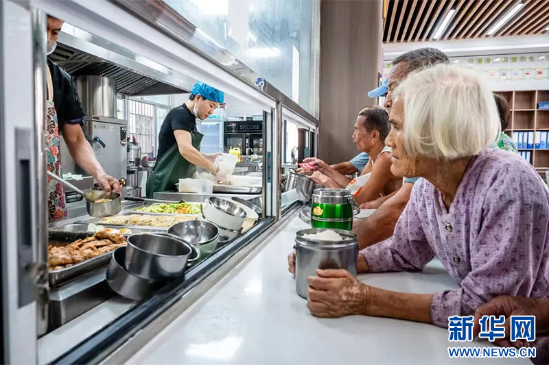 老年人在工作人員的引導下通過人臉識別完成就餐結算。新華網發