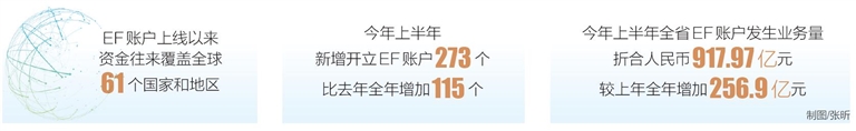 自去年5月6日上線以來,EF賬戶的應用場景逐漸豐富,目前已完成超1700億元跨境資金流動的結算,資金往來覆蓋全球61個國家和地區。