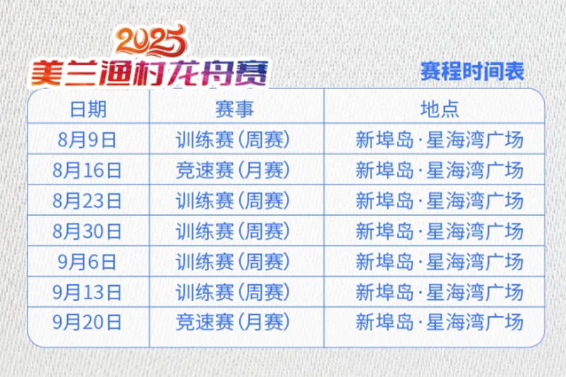 2025美蘭漁村龍舟賽第二場周賽將于8月9日15時30分在??趩⒛?。本周活動內容包含文藝表演、趣味互動游戲、樂隊演出和榮耀頒獎,將打造一場水岸嘉年華。