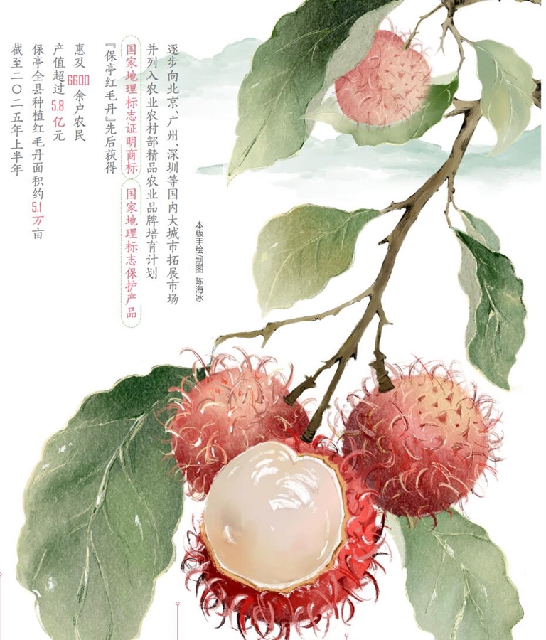 自20世紀60年代“漂洋過?!甭鋺舯Mず?,紅毛丹與保亭結下深深情緣。近年來,保亭縣當地政府聯合科研機構持續攻關,培育出保研5號、6號、7號等優良品種,其中“保研7號”果肉質脆甜、高產穩產,成為主推種植品種。經過換冠改良技術,保亭縣對低產紅毛丹品種逐步淘汰,新優品種全面覆蓋,極大提高了紅毛丹的產量和品質。