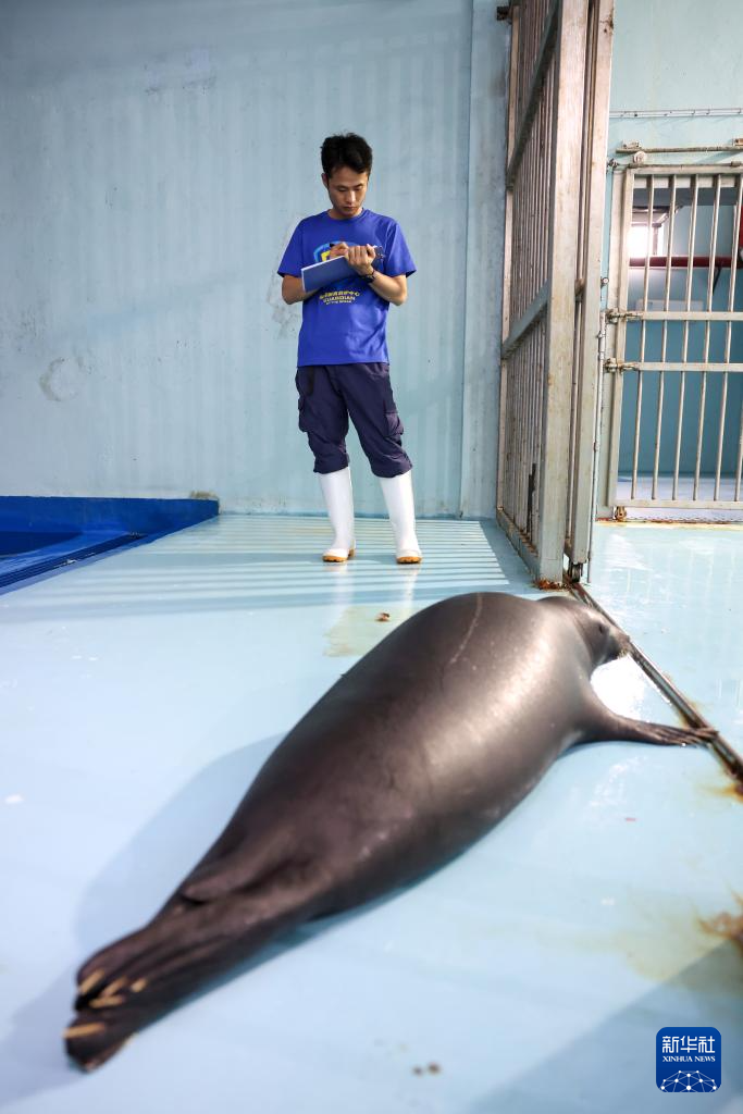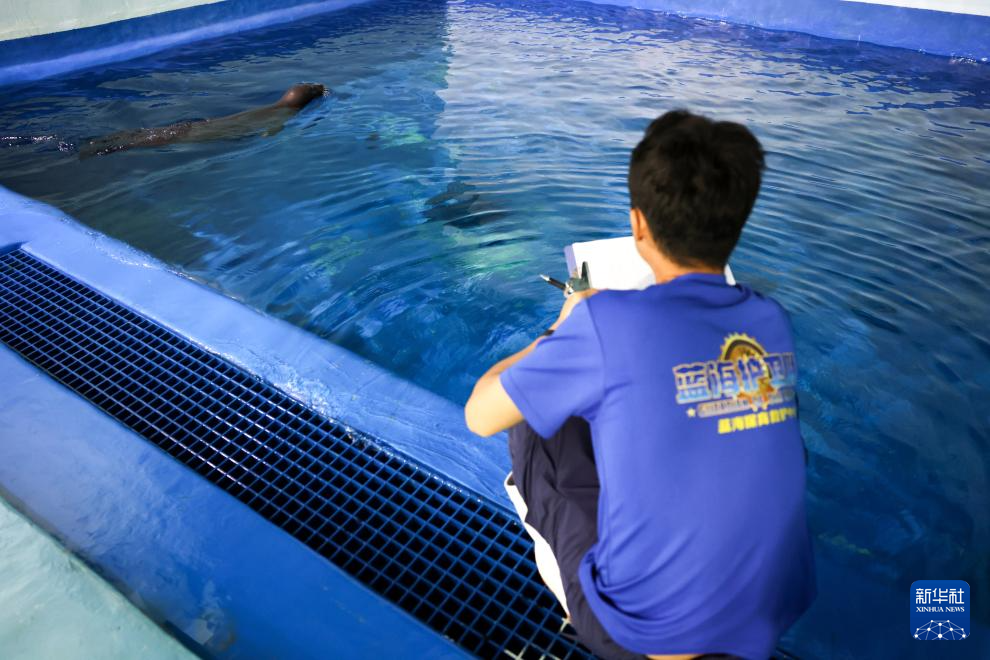 9月8日,在海南陵水藍海保育救護中心,救助人員在觀察記錄海豹“阿儂”的行為。新華社記者 張麗蕓 攝
