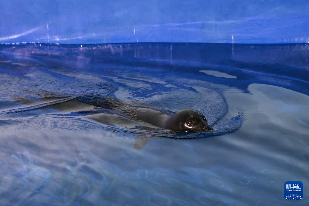 9月8日,海豹“阿儂”在海南陵水藍海保育救護中心的救助池中游泳。新華社記者 張麗蕓 攝