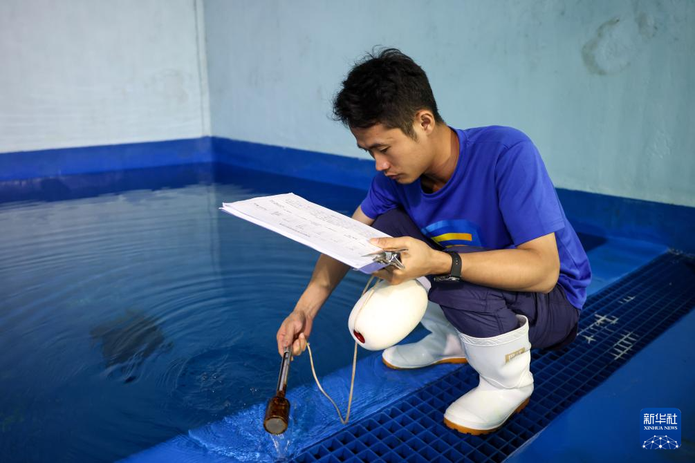 9月8日,在海南陵水藍海保育救護中心,救助人員在測試水溫。新華社記者 張麗蕓 攝