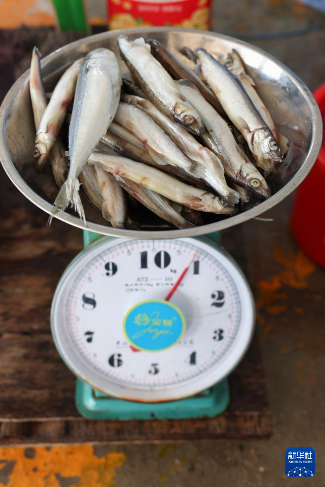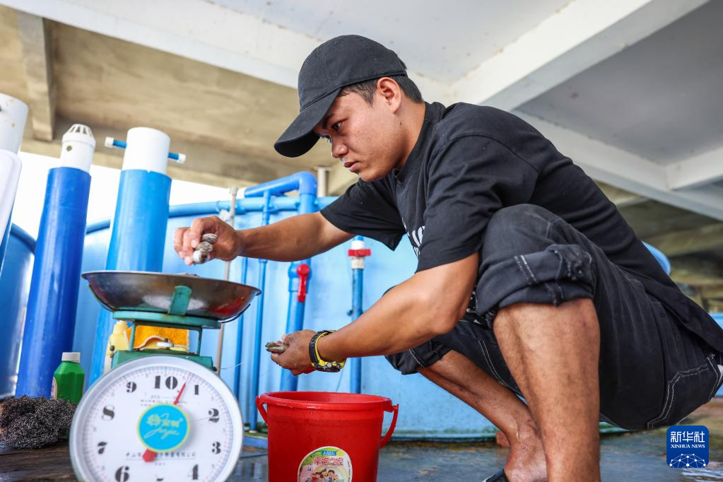9月8日,在海南陵水,救助人員在給海豚“萬萬”的食物稱重。新華社記者 張麗蕓 攝