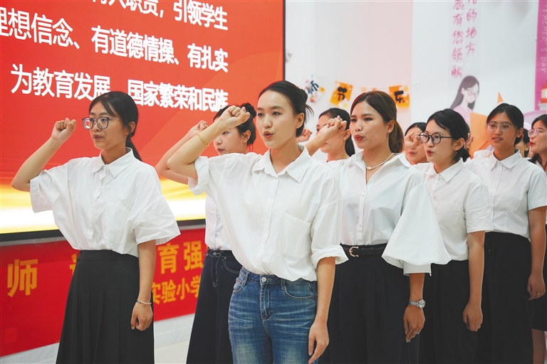 9月10日,??谑形餍銓嶒炐W舉行慶祝第41個教師節暨先進表彰大會,20余名新教師莊嚴宣誓。海南日報全媒體記者 張茂 通訊員 王倩倩 圖/文