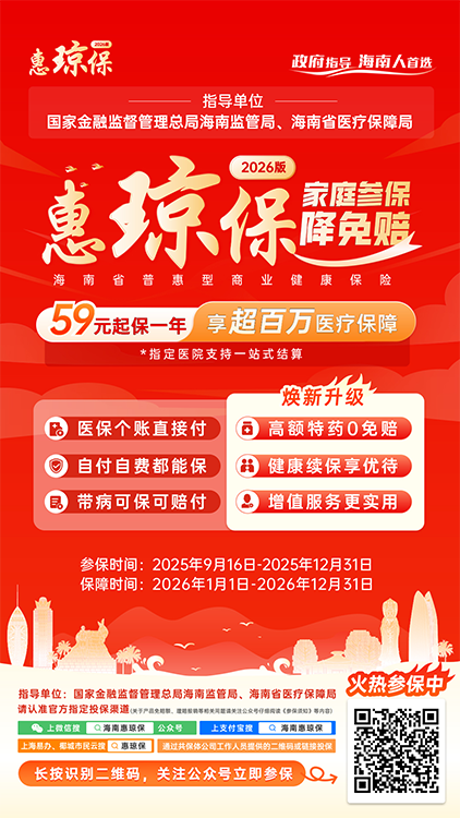 目前,“惠瓊?!?026版已開放參保,即日起,海南省基本醫療保險參保人、海南省內定居且辦理居住證的人員、具有海南本省戶籍的人員、持有海南身份證的人員、海南掛職人員、被認定為海南省高層次人才的人員、新市民、靈活就業人員,上述人員均可關注官方參保平臺“海南惠瓊?!蔽⑿殴娞?,為本人及其父母、配偶、子女統一辦理參保,也可以通過支付寶、海易辦、海南農商行、云閃付、椰城市民云在線參保,另外還可以通過13家共保體公司的專業工作人員咨詢參保相關事宜。參保期截至2025年12月31日,保障期為2026年1月1日—2026年12月31日。
