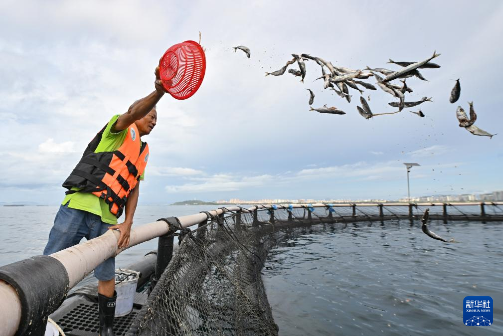 9月17日,陵水黃鰭金槍魚海上養殖示范基地工作人員在投喂金槍魚。新華社記者 郭程 攝
