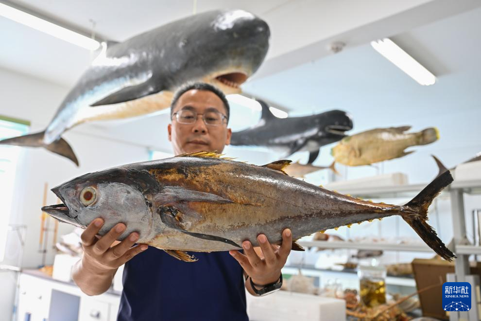 9月17日,中國水產科學研究院南海水產研究所研究員秦傳新展示一尾黃鰭金槍魚標本。新華社記者 郭程 攝