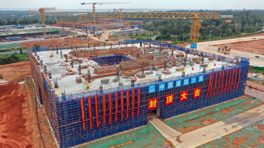 這是海南莫斯科動力大學(籌)校區一期首棟封頂建筑(10月25日攝,無人機照片)。