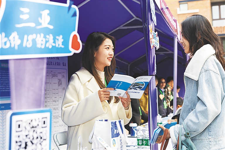 活動現場氛圍熱烈,求職者眾多。在瓊工作人才代表結合自身工作生活經歷作推介,海南國際經發局相關負責人介紹海南重點產業發展情況。會場還設置了企業展位區、人才政策展示墻、面試洽談區、直聘簽約區、大學生來瓊創新創業咨詢區等多個特色專區,并搭建線上招聘“云平臺”,為求職者提供便利。