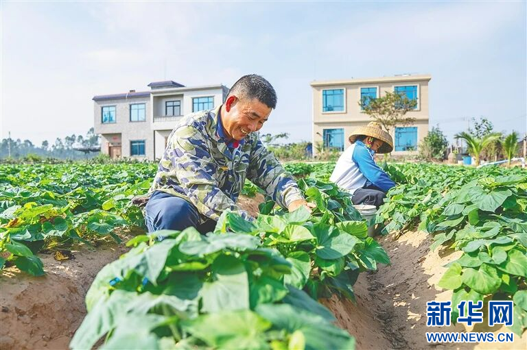 在澄邁縣橋頭鎮沙土村,村民清理影響地瓜生長的雜草。新華網發