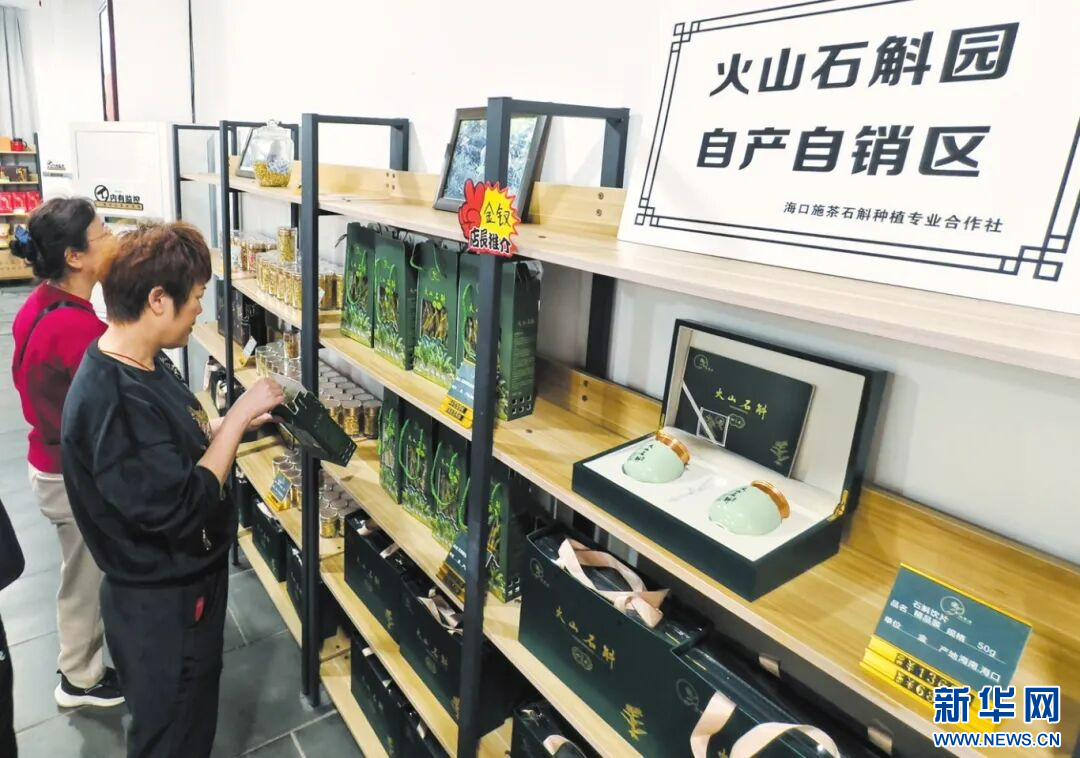 施茶村的火山石斛產品展示廳里,游客們正挑選伴手禮。新華網發